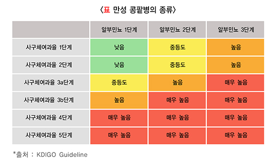 사구체 여과율과 알부민뇨 모두 단계가 높을수록 심한 콩팥 기능의 감소를 의미합니다. 즉 같은 사구체 여과율이라고 하더라도 알부민뇨가 많을수록 말기 신부전으로 이행할 위험성이 높아집니다. 따라서 사구체 여과율과 함께 알부민뇨에 대한 관리도 함께 하는 것이 중요합니다.