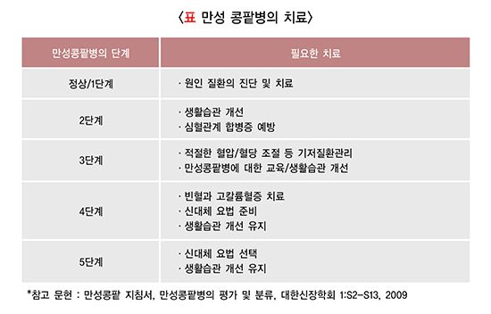 만성콩팥병의 가장 기본적인 치료는 원인 질환에 대한 치료입니다. 원인이 당뇨병이라면 철저한 혈당 조절이, 고혈압이라면 수축기 혈압을 120 mmHg 미만으로 철저한 혈압 조절이, 사구체 질환에 의한 만성콩팥병이라면 각 사구체 질환에 대한 특이적인 치료가 만성콩팥병의 치료입니다.