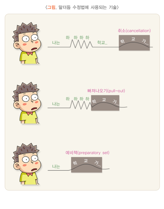 말을 더듬는 사람은 말을 더듬지 않으려고 부단히 노력합니다. 그러다가 더듬을 가능성이 있는 낱말이 문장 속에서 접근해 오면 각종 회피 행동을 동원하여 더듬지 않으려고 노력합니다. 실례들을 살펴본다면 동의어로 바꿔치기(버스표-차표, 정류장-차, 타는 데, 방법-수단, 도둑-강도), 돌려 말하기(초등학교-아이들이 공부하는 데, 숙제 있냐?-뭐 할 것 있냐?, 물 좀 주세요, 목탄다), 다른 말 앞세우기(콩-흰콩, 담배 주세요-아저씨 담배 주세요, 졸려 죽겠다-아이구 졸려 죽겠다) 등이 있습니다.