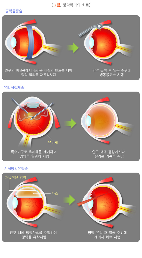 망막에 열공이 발생하였으나 망막박리를 일으키지 않은 경우에는 수술 이외의 치료로 망막박리를 예방할 수 있습니다. 그러나 일단 망막이 박리되면 수술적인 방법으로만 치료가 가능합니다.