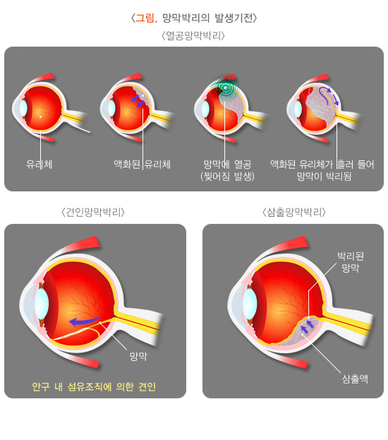 망막박리는 발생기전에 따라 열공 망막박리, 견인 망막박리, 삼출 망막박리의 세 가지로 나뉩니다.