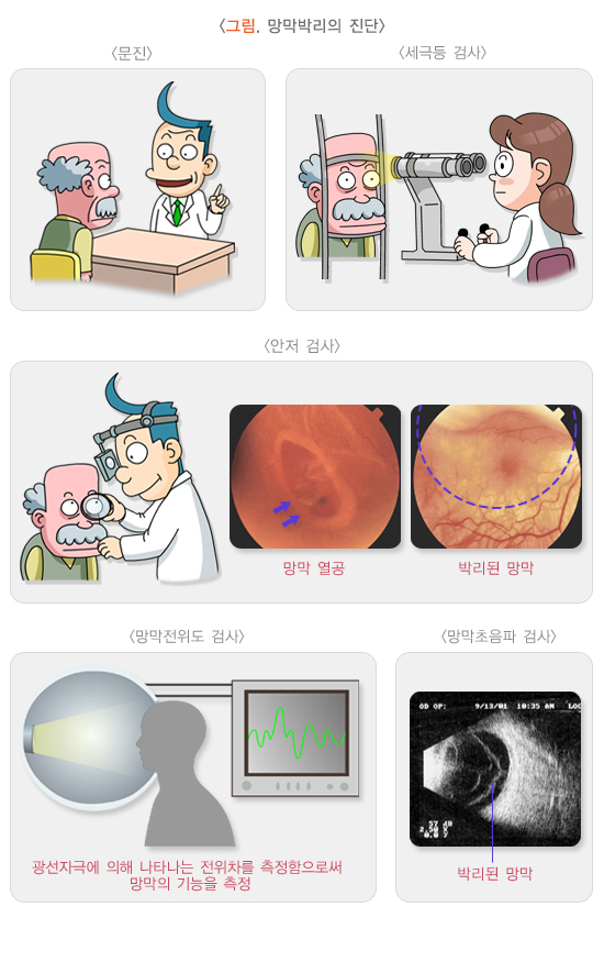 수정체, 유리체 또는 각막의 혼탁으로 안저를 적절히 관찰할 수 없을 경우, 망막의 기능적 측면을 간접적으로 파악하기 위해 망막전위도검사를, 안구의 해부학적인 이상을 파악하기 위해 초음파 검사를 시행합니다. 초음파 검사를 통해서 박리된 망막을 관찰할 수 있습니다.