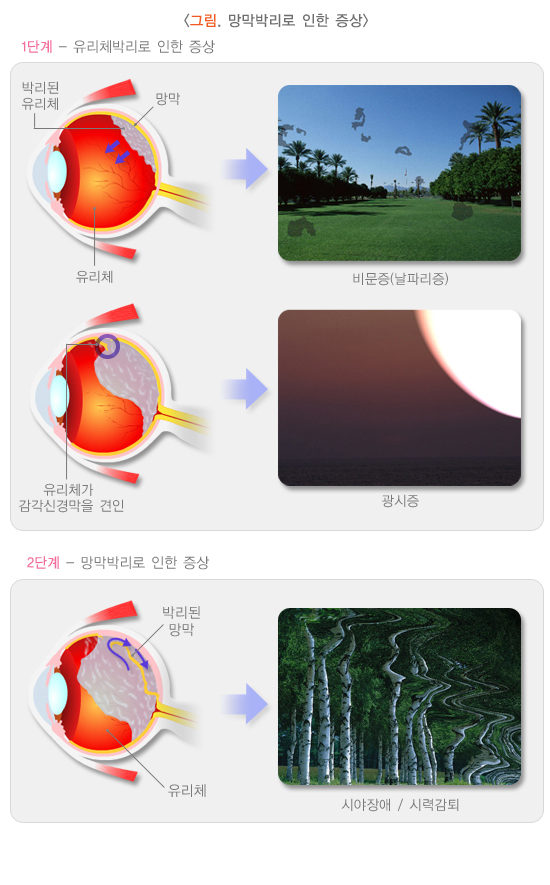 3. 망막박리 전구증상(눈 앞에 떠다니는 것이 많아지거나[날파리증], 번쩍거리는 증상[광시증]) 및 망막박리 의심 증상(커튼을 치듯 시야 일부가 까맣게 가려 보임)이 생길 경우 즉시 안과를 찾는 것이 좋습니다.