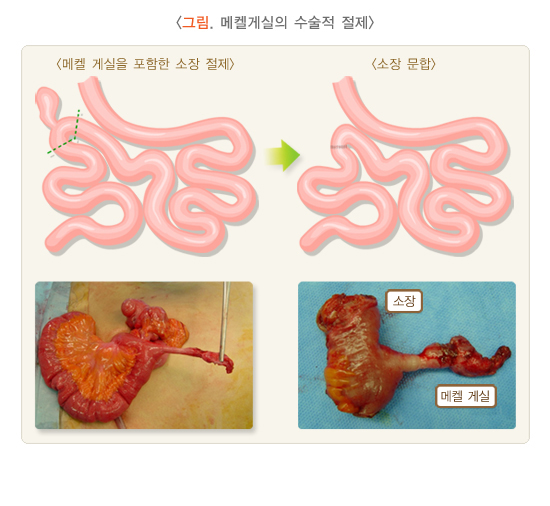 염증성 합병증은 게실만 절제하거나 게실과 관련된 장을 같이 절제하는 것으로 치료되지만, 드물게 환아의 상태가 너무 좋지 않으면 일시적인 장루(인공 항문)가 필요할 수도 있습니다.