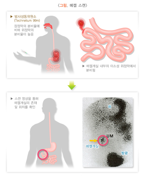 테크네시움(technetium-99m)이라는 방사성동위원소를 이용한 핵의학검사는 1970년 이후 ‘이소성 위 점막’을 발견하기 위해 사용되었으며, 대표적인 진단 검사입니다. 테크네시움을 운반하는 퍼테크네테이트 이온(pertechnetate ion)은 위 점막세포에 흡수 저장되었다가 장내로 분비됩니다. 현재 테크네시움-퍼테크네테이크(99mTc-pertechnetate)를 이용한 검사가 많이 이용되고 있으며, 소량의 동일한 세포들이 전체 장에 걸쳐 분포하나 장점막의 분비율은 위 점막에 비해 아주 낮습니다. 어린이에서 이 검사의 진단적 정확성은 높으나 성인에서는 게실내 이소성 위점막의 빈도가 낮기 때문에 테크네시움-퍼테크네테이크 검사의 정확도는 50% 미만입니다.