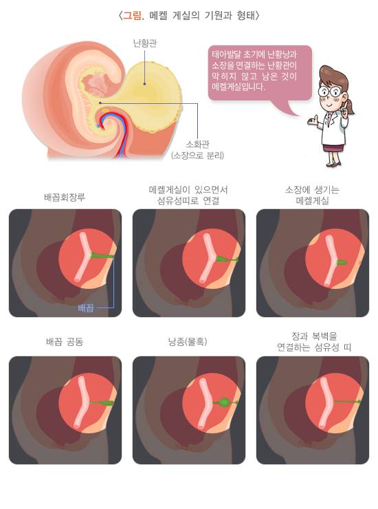 보통 난황관은 태반이 난황낭을 대신해 태아 발달을 위한 영양의 주공급원이 되는 임신 5~7주 사이에 퇴화합니다. 메켈 게실은 난황낭과 태아의 소장을 연결하는 난황관이 폐쇄되지 않아 생기는 질환입니다.