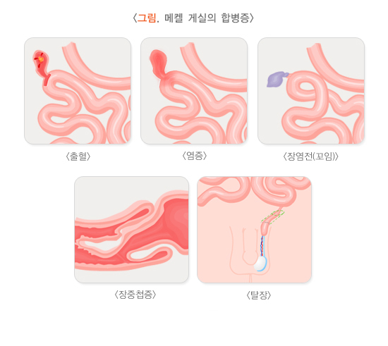 배꼽은 남아 있는 난황관 점막이 바깥으로 탈출되어 회장루처럼 보이기도 하는데, 심한 탈홍(직장탈출)은 장 폐쇄를 일으키거나 장의 혈액공급을 방해하기도 합니다. 주혈흡충증 또는 회충증 같은 기생충감염 시 메켈 게실 내에서 이물질이나 돌이 보고된 바 있고, 메켈 게실 환자에서 드물게 원발성 위장관 암(카르시노이드 종양, 육종, 림프종, 선암, 평활근종)이 보고되었습니다. 종양은 보통 성인에서 발견되며, 카르시노이드 종양이 가장 흔합니다. 104개의 암 증례에 대한 연구논문에서 환자들의 평균 연령은 57세였고, 남자가 여자보다 2.5배 많았습니다. 진단 당시 3/4에서 원격 전이가 있어 다른 종양에 비해 공격적이었습니다. 크기가 5 mm를 넘는 큰 종양은 전이 위험성이 의미 있게 높으며, 카르시노이드 증후군이 발생하기도 합니다. 이 경우에도 수술 치료는 게실을 포함한 회장과 주변의 림프절을 포함한 장간막을 같이 절제합니다.