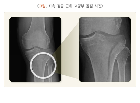 근위(부) 경골부 골절은 축방향이나 측방향에 무게가 실리거나 두 현상이 함께 일어나면서 대퇴골이 경골(정강뼈)에 부딪쳐서 경골 고평부(근위(부) 관절면) 골절이 발생하는 경우가 많습니다. 외측 경골의 골절이 내측에 비해서 많이 발생하고, 노인의 뼈와 같이 약한 뼈에서는 함몰 골절이 일어나기 쉽습니다. 골절 외에 인대나 연골판, 신경, 혈관과 같은 연부조직 손상이 동반될 수 있으므로 주의하여야 합니다.