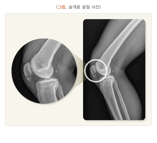 슬개골 골절은 대부분 대퇴슬개 관절면을 침범하는 관절 내 골절의 형태로 발생하며, 관절면의 층 형성이 2mm 이상이거나 골절편(골절 조각)의 전위가 3mm 이상인 경우 수술적 치료가 필요합니다. 보존적 치료가 가능한 경우엔 원통형 또는 장하지(긴다리) 석고 고정을 시행한 후 슬관절 경첩 보조기를 착용하거나, 처음부터 보조기를 착용할 수 있습니다. 수술적 치료를 시행할 경우에는 나사못, 강선 등을 사용하여 고정하거나, 부서진 정도가 너무 심한 경우 골절편 제거 등을 시행 할 수 있습니다.