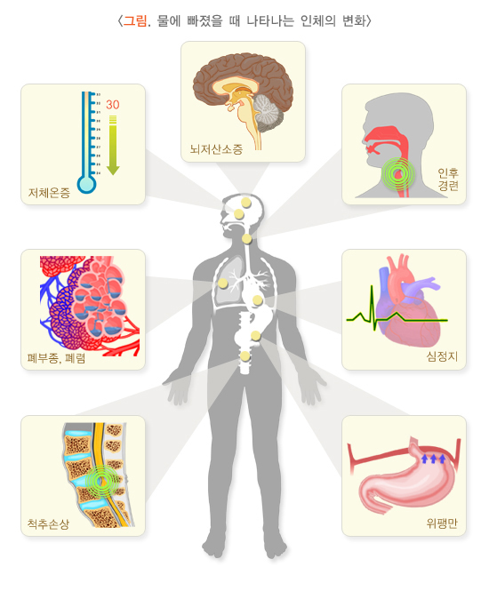 물에 빠진 사람이 호흡이 없어지게 되는 경우에는 무호흡 상태로 인하여 저산소증과 이산화탄소증을 일으키게 됩니다. 그리고 이와 같이 산소결핍이 계속되면 혼수상태에 빠지게 되고, 더 진행하게 되면 호흡성 심정지까지 이르게 됩니다. 뿐만 아니라 폐로 흡인된 물로 인해 급성 폐손상이나 급성 호흡부전 증후군에 빠지게 됩니다. 그리고 수온의 영향으로 저체온증에 빠질 수 있으며, 이 때문에 신경학적, 혈역학적, 혈액학적인 변화를 일으켜 다양한 임상양상을 나타낼 수 있습니다.