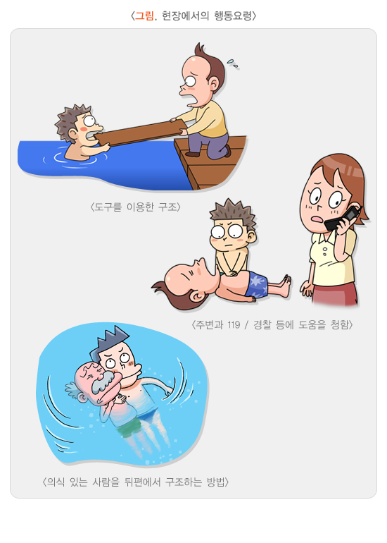 119 구조대나 수상구조대, 경찰에 신고를 하도록 도움을 요청하는 것이 가장 좋은 구조방법입니다. 특히 구조자 혼자만 있는 상황에서는 무모하게 물에 뛰어 드는 것은 이차적인 위험을 야기할 수 있어 신중해야 합니다.