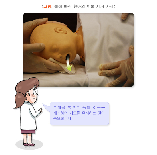 만약 수중에서 구조에 자유로운 상황이라면 물 속에서라도 인공호흡을 하면서 물 밖으로 구조하는 것도 환자 회복에 도움을 줄 수 있습니다.