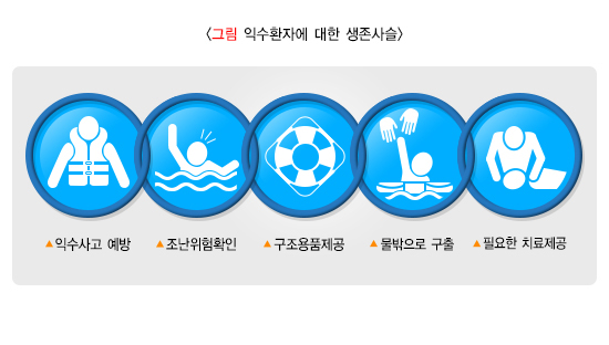 익수환자의 치료는 치료에 앞서 예방이 우선되어야 하며 발생시에는 빠른 인지와 구조용품을 이용한 구조, 그리고 지상으로 환자를 구출하고 필요한 치료를 제공하는 일련의 과정이 모두 유기적으로 이루어져야만 합니다. 이를 익수환자에 대한 생존사슬이라고 합니다.
