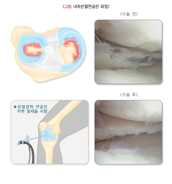 절제술은 파열된 연골판의 경계를 부드럽게 다듬어 주고 추가적인 파열을 막는 방법으로 절제 범위에 따라 부분 절제술, 아전 절제술, 전 절제술 등으로 구분할 수 있습니다.