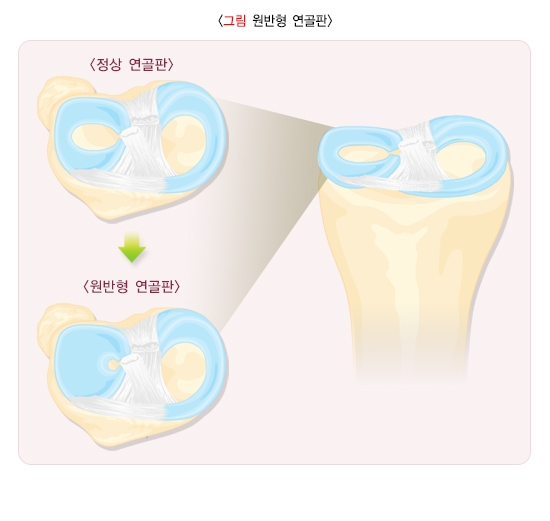 원판형 연골판은 반월상 연골판의 특수한 형태로 연골판이 넓고 두꺼우며 O자형인 경우를 말합니다. 주로 외측 연골판에서 나타나며, 서양인(3-5%) 보다는 동양인(10-15%)에서 흔하게 발생합니다. 국내에서는 연골판 양측에서 원판형 연골판이 발생하는 비율이 90%에 이른다고 알려져 있습니다. 원판형 연골판 손상 증상은 소아나 청소년 때부터 나타날 수 있습니다. 증상을 일으키는 파열된 원판형 연골판은 관절경을 이용하여 부분절제술과 봉합술로 치료합니다. 그러나 증상이 없고 MRI 검사로 발견된 원판형 연골판에 대해서는 치료가 필요하지 않습니다.