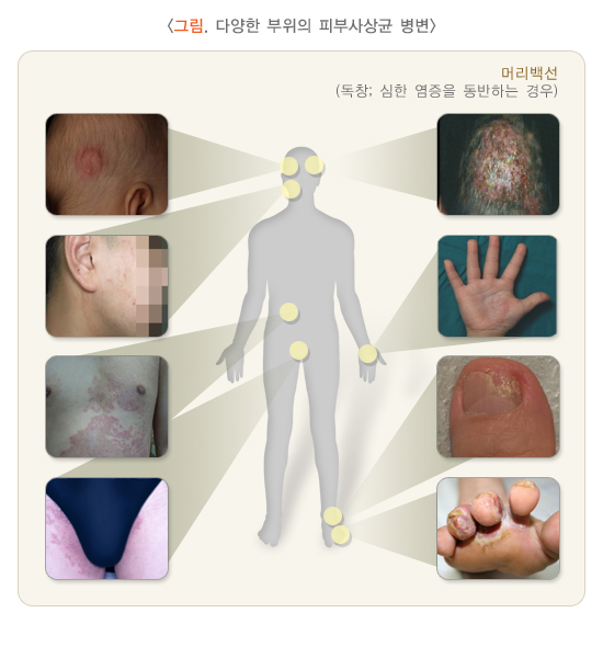 백선은 피부사상균에 의해 피부와 피부 부속기에 발생하는 모든 표재성(표면 또는 표면 아래 얕은 부위에만 병변이 국한된 경우) 감염을 의미합니다. 백선은 발생 부위에 따라 머리 백선, 몸통 백선, 사타구니 백선, 턱수염 혹은 콧수염에 발생하는 수발 백선, 얼굴 백선, 손 백선, 발 백선(무좀), 손발톱 백선 등으로 분류합니다.
