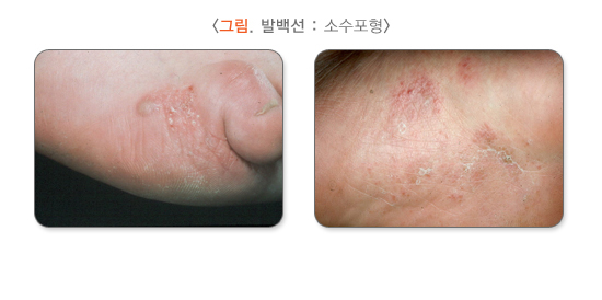 이상 세 가지 병형은 명백하게 구분하기 어려울 때가 많으며, 여러 병형이 복합되어 나타나는 경우가 많습니다. 지간형과 소수포형은 긁거나 각질용해제로 과하게 치료하면 피부 장벽이 손상되어 이차적인 세균 감염이 생길 수 있습니다. 발 백선 환자는 손발톱백선증이 동반되는 경우가 많은데, 손발톱백선증은 치료가 어렵고 치료가 잘 되지 않는 경우 손발톱에서 재감염이 될 수 있습니다.