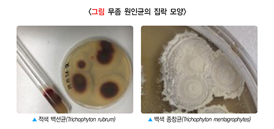 과각화형(발바닥에 각질이 두터워지는 형태)과 지간형(발가락 사이가 짓무르거나 갈라지는 형태)은 적색 백선균(Trichophyton rubrum), 소수포형(발바닥에 작은 물집이 잡히는 형태)은 백색 종창균(Trichophyton mentagrophytes)이 많습니다.