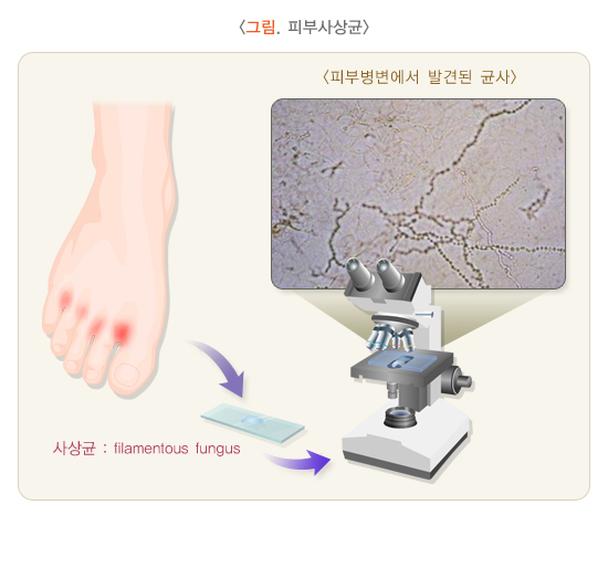 발에 피부병변이 생겼다고 모두 무좀은 아니므로 치료 전에 반드시 진균 검사를 통한 확진이 필요합니다. 진균학적 검사에는 직접 도말 검사(KOH 도말 검사)와 진균 배양 검사 등이 있습니다.