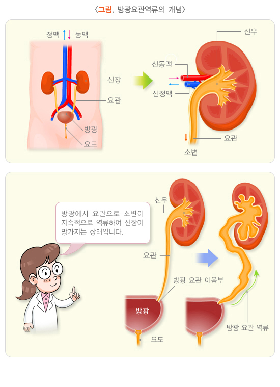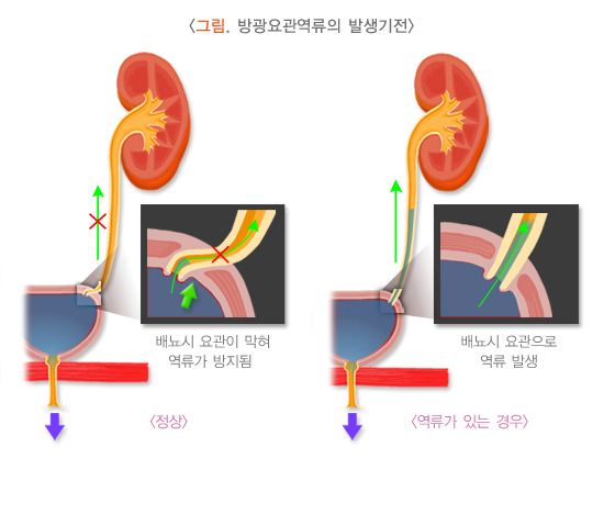 정상 아이의 경우 배뇨 후에 방광이 비게 되지만, 방광요관 역류가 있으면 배뇨 후에도 방광에 소변이 남아있게 됩니다. 이러한 잔류 소변은 방광에서의 세균 증식을 쉽게 하고, 세균으로 감염된 소변은 역류로 인해 다시 상부 요관과 콩팥으로 역류하여 콩팥의 손상을 일으키게 됩니다.
