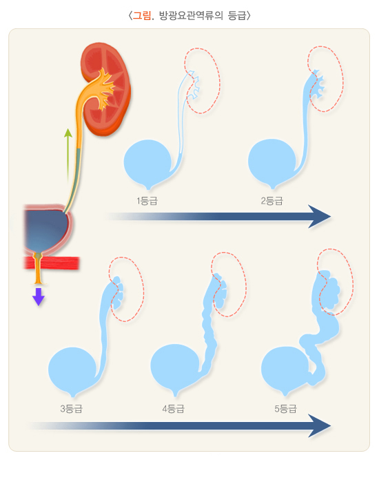 방광요관역류의 중증도는 국제 연구회의 역류 정도 분류에 따라 1등급에서 5등급으로 나뉠 수 있으며, 역류의 등급이 높을수록, 콩팥 손상의 위험도가 증가합니다.