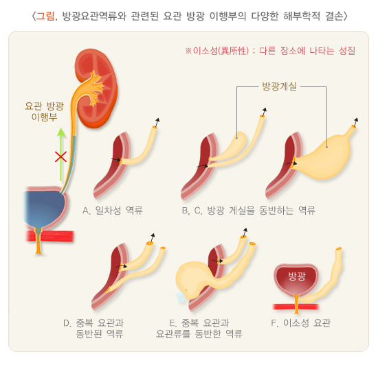 정상적인 요관 방광 이행부(ureterovesical junction)는 요관이 방광의 삼각 부위로 들어가면서 비스듬히 각을 형성하고 이것이 점막 하층을 통과하면서 터널을 형성합니다. 방광이 소변으로 채워져 방광이 늘어나면 요관의 점막하 터널이 늘어나면서 닫히게 되며, 이런 과정을 통해 방광 안의 소변이 요관으로 역류하지 않게 됩니다. 비정상적인 경우 요관이 방광으로 열리는 입구의 위치가 위, 옆쪽으로 이동되며, 심할수록 점막하 요관의 길이가 짧아지거나 없어져서 점막하 터널이 짧아지고 방광요관역류가 발생합니다.