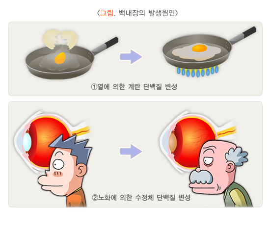 투명한 계란 흰자가 열을 받으면 희고 불투명하게 바뀌는 것은 계란 흰자를 구성하는 단백질이 열에 의해 변성되기 때문입니다. 백내장도 이와 마찬가지로 수정체 속의 단백질이 노화나 여러 가지 원인에 의해 변성되면서 뿌옇게 흐려지기 때문에 발생합니다.