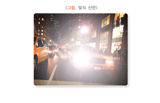 자동차 헤드라이트나 가로등 같은 밝은 빛을 바라볼 때 혼탁한 렌즈를 통과한 빛이 산란되면서 빛이 퍼져 보이거나 눈부심이 나타날 수 있습니다.