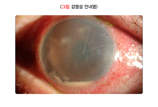 수술 1~2일 후에 드물게 발생하는 질환으로 안구 내 심한 염증과 함께 전체 각막이 심하게 부어오르며 강도 높은 항염증 치료가 필요합니다. 병의 정도에 따라 호전에 수 일에서 수 개월까지 걸릴 수 있으며, 치료 후에도 각막부종, 홍채손상, 홍채앞/후유착, 만성낭포황반부종 등으로 시력저하가 지속될 수 있습니다.