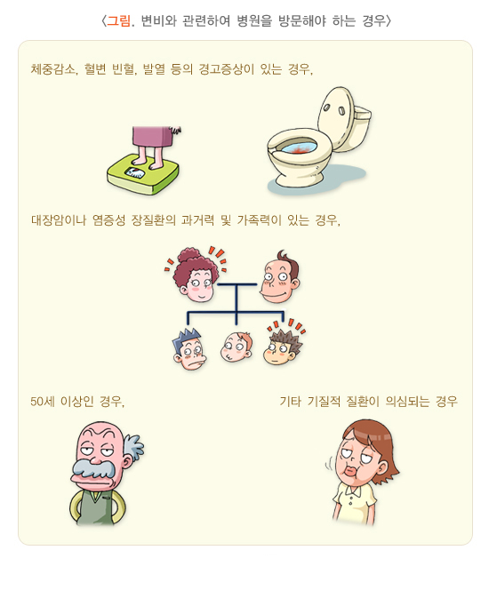 이상의 증상 중 어떤 것이라도 생활에 불편이나 지장을 줄 경우에는 의사와 상의하는 것이 좋습니다. 특히 체중감소, 혈변, 빈혈, 발열 등의 경고 증상이 있는 경우, 대장암이나 염증장질환의 과거력 및 가족력이 있는 경우, 50세 이상인 경우, 기타 기질적 질환이 의심되는 경우 병원을 방문하여 검사를 받는 것이 좋습니다.