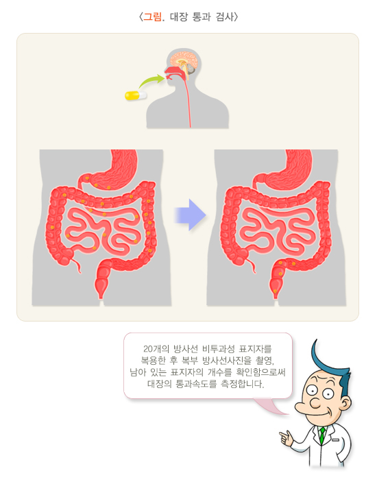 통과 속도가 느린 것에 대한 객관적인 증거가 필요할 때 시행하는 검사입니다. 방사선 비투과성 표지자 검사(Radiopaque marker study)는 20개의 방사선 비투과성 표지자를 한번 복용한 후 5일째 복부 X선 검사를 시행하는 방법이며, 표지자가 복용 후 5일 동안 80% 이상 대장을 통과하는 것이 정상인데 대장에 남아있는 경우를 장무력증(Colonic inertia) 또는 지연통과(Delayed transit)라고 합니다. 검사의 민감도를 올리기 위해 연속 3일간 24시간 간격으로 서로 다른 모양의 표지자를 복용하고 72, 96, 120시간 째에 X선 검사를 시행하는 방법도 있습니다. 이때는 120시간 후에 네 개 이상의 표지자가 계속 남아 있으면 통과 속도가 느리다고 할 수 있습니다.