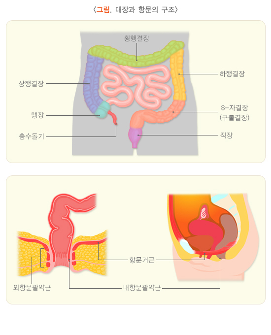 대장은 기다란 관 모양으로 위치에 따라 맹장, 상행결장, 횡행결장, 하행결장, S-자결장(구불 결장), 직장으로 나눌 수 있으며 총 길이는 1.5 m 입니다. 대장의 내용물은 대부분 음식물 찌꺼기와 수분, 전해질, 세균 그리고 가스로 이루어져 있습니다. 대장은 이 중 수분과 전해질을 흡수하고, 배변과 배변 사이에 장 내용물을 저장하였다가 항문 밖으로 배출시키는 역할을 합니다. 직장과 연결된 항문 역시 배변에 아주 중요한 역할을 합니다. 항문관의 길이는 약 3~4 cm이며, 주변에 내항문괄약근, 외항문괄약근, 항문거근 등 배변과 관련한 근육이 많이 분포해 있습니다.