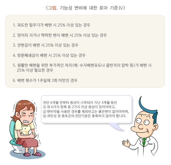 변비 환자들이 호소하는 증상은 매우 다양하여 단지 배변 횟수만으로 변비를 진단하기 어려운 경우가 많습니다. 따라서 이를 해결하기 위해 여러 학자들이 주기적으로 모여 6가지 대표적인 증상으로 변비의 객관적인 기준을 정하고 있는데, 이를 로마기준이라 부릅니다.