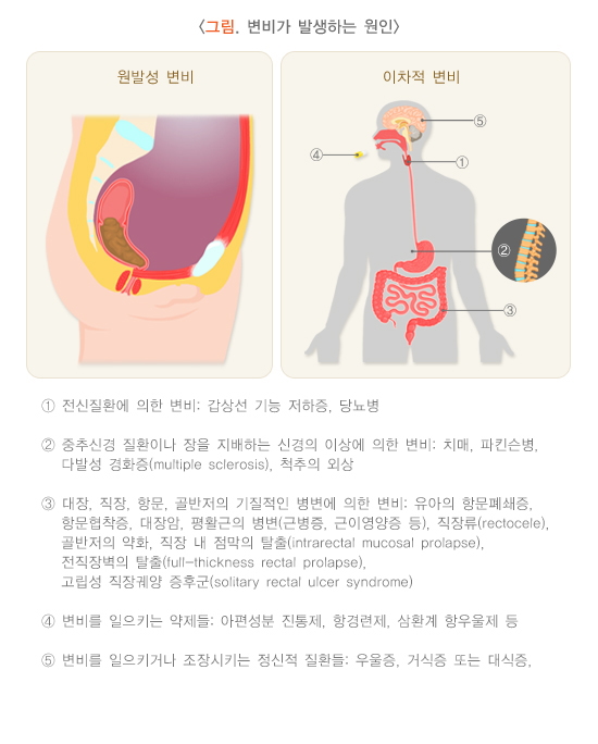 변비의 원인은 크게 다른 질환에 의해 이차적으로 증상이 발생한 경우와 명확한 원인 없이 대장, 직장의 운동기능장애로 인해 발생하는 원발성 또는 기능성 변비로 나눌 수 있습니다.