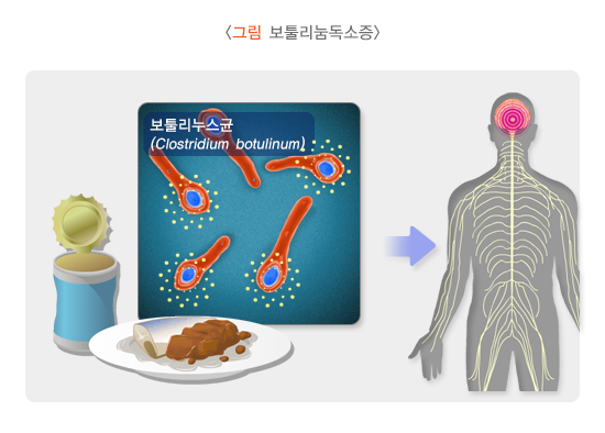 ⦁ 식품매개 보툴리눔독소증: 잘못 보관되어 독소를 생산하는 보툴리눔균에 오염된 음식을 섭취하여 발생합니다.