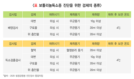 - 검체(혈액, 대변, 구토물, 위흡인물 등)에서 C.botulinum 독소 검출