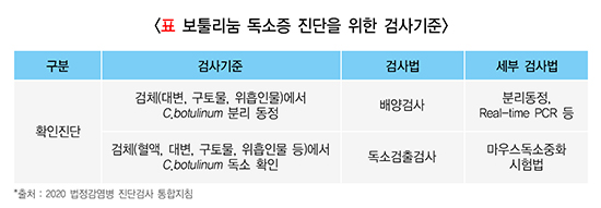 - 환자: 보툴리눔독소증에 부합되는 임상증상을 나타내면서 진단을 위한 검사기준에 따라 해당 독소 또는 감염병 병원체 감염이 확인된 사람