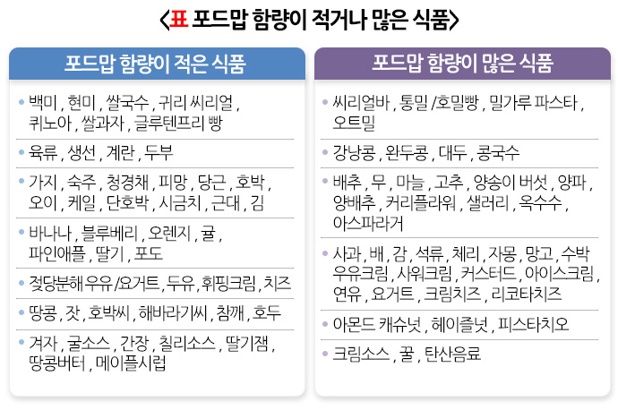 최근에는 기능성 팽만감을 호소하는 과민 장증후군 환자에서 포드맙 함량을 낮춘 저포드맙 식이가 각광을 받고 있습니다. 포드맙(Fermentable oligosaccharides, Disaccharides, Monosaccharides, and Polyols, FODMAPs)은 장내 세균에 의해 발효되는 올리고당, 이당류, 단당류, 폴리올 등 저분자 탄수화물을 말합니다. 소장에서 흡수되지 않고 미생물에 의해 발효되어 가스를 생성하며, 삼투압에 의해 대장 내 수분 증가 및 대장 내강의 확장을 일으킵니다. 이런 포드맙이 많이 포함된 음식을 제한하여 섭취하면 복부 팽만감이 좋아진다고 합니다. 저포드맙 식이에 대해서는 과민 장증후군 치료 관련 정보(링크)에서 좀더 구체적인 내용을 확인할 수 있습니다.