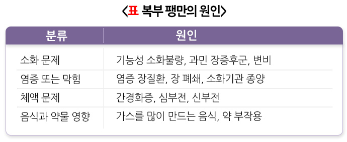 복부 팽만을 일으키는 원인은 매우 다양합니다. 만성적인 복부 팽만은 기능성 소화불량, 과민 장증후군, 변비 등의 기능성 위장관 질환과 관련이 높습니다. 하지만 염증 장질환, 장 폐쇄, 소화기관 종양 등도 복부 팽만을 일으킬 수 있습니다. 복강 내에 복수가 차면 팽만이 생기므로 복수를 일으키는 간경화증, 심부전, 신부전 등의 질환도 원인이 될 수 있습니다. 또한 가스를 많이 만드는 음식의 영향이나 특정 약 부작용으로도 복부 팽만감이 생길 수 있습니다.
