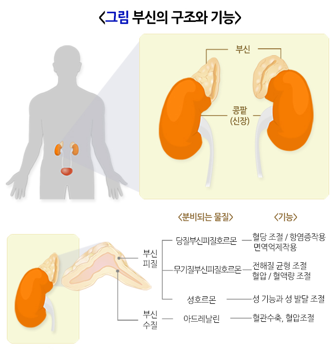 부신은 양쪽 콩팥 위에 위치하는 대표적인 내분비샘입니다. 우리 몸에는 부신 외에도 뇌하수체, 갑상샘, 췌장, 고환, 난소와 같은 다양한 내분비샘이 존재하며 이들은 각기 다른 호르몬을 혈액 내로 직접 분비하여 신체의 다양한 생리적 기능과 대사를 조절하는 역할을 합니다.