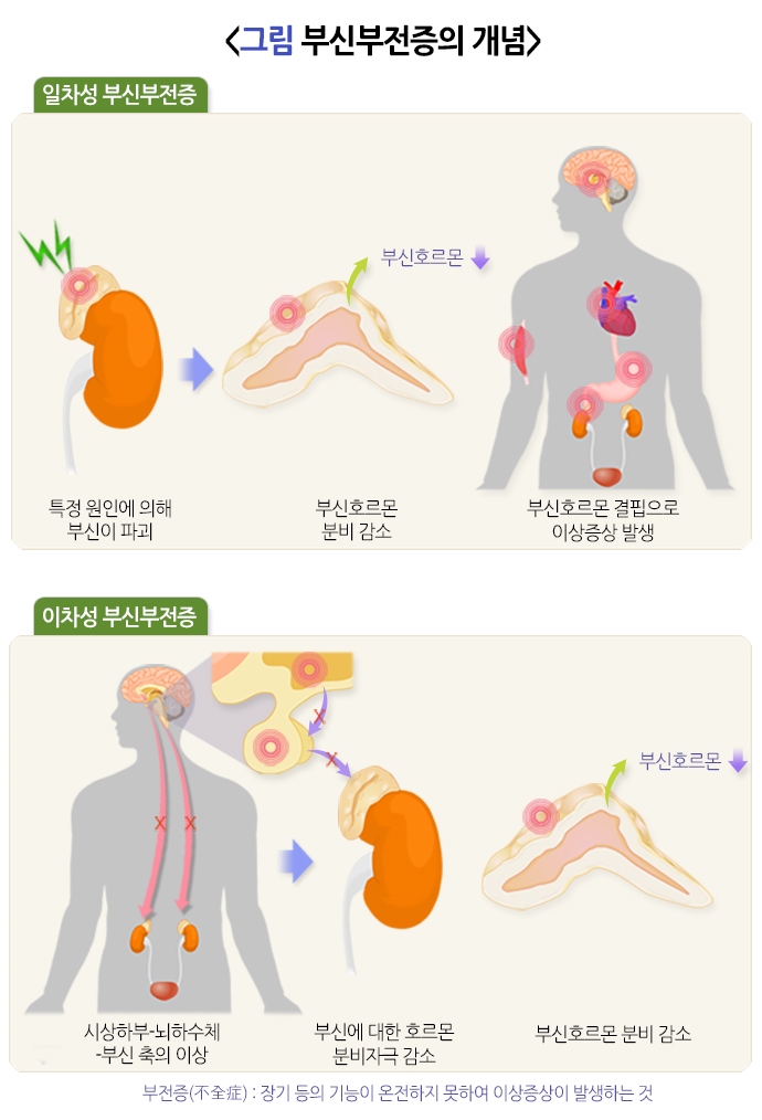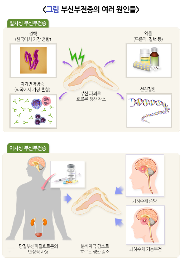 부신 자체 문제로 인한 부신부전증을 일차성 부신부전증이라고 합니다. 반면, 뇌하수제종양이나 방사선 치료 등에 의해 시상하부-뇌하수체-부신 축의 이상으로 부신의 당질부신피질호르몬 합성이 안 되어 부신이 활성화되지 않는 부신부전증을 이차성 부신부전증이라고 합니다.