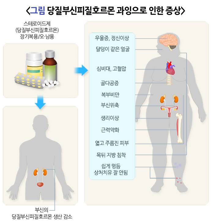 피부가 매우 얇아지고 사소한 충격에도 쉽게 멍이 드는 경우가 많습니다. 골다공증의 위험이 높아져서 허리에 압박골절이 생길 수 있습니다. 관절주사를 맞는다든가 통증치료를 받는다든가 성분을 모르는 약제나 건강보조식품 등을 복용하는 중에 위와 같은 증상이 생기면 내분비 내과 전문의와 꼭 상의하여야 합니다.