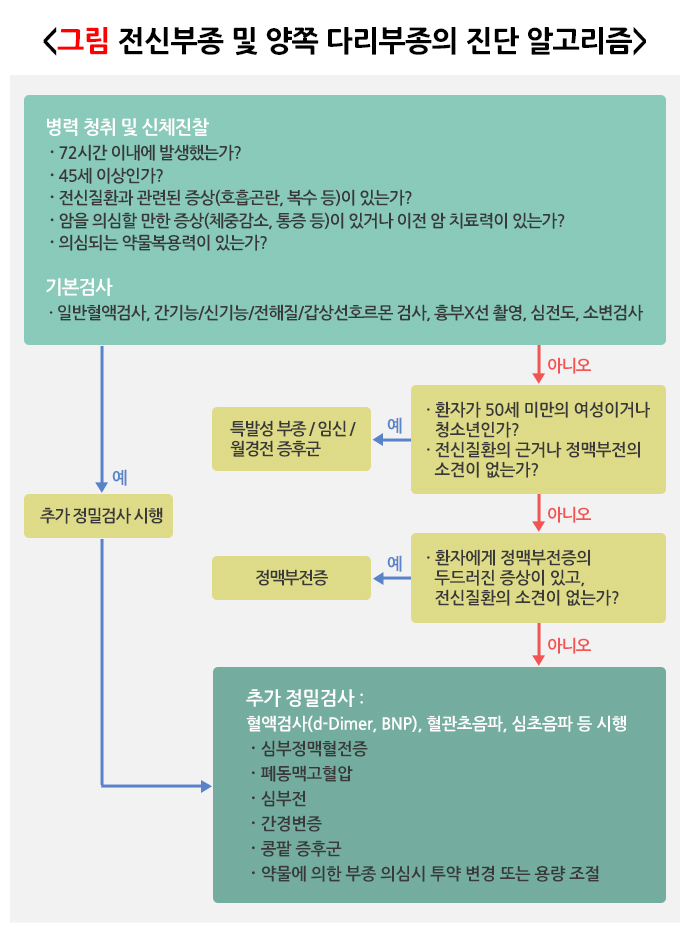 부종은 하나의 증상으로 부종을 일으키는 원인 질환에 대한 진단이 중요합니다. 원인 질환에 대한 진단은 병력 청취, 신체 진찰, 임상 검사 과정을 통해 이루어집니다. 전신 부종 또는 양쪽 다리 부종의 경우에는 72시간 이내에 발생한 부종인지, 관련된 다른 증상이나 질환의 치료력이 있는지, 의심되는 투약력이 있는지 먼저 확인하고, 혈액검사, 흉부X선 촬영, 심전도, 소변검사 등을 통해 폐동맥 고혈압, 심부전, 간경변증, 콩팥증후군, 림프부종 등에 대한 추가 정밀검사를 시행합니다. 폐경 전 여성이면서 다른 질환의 가능성이 낮은 경우에는 특발성 부종, 임신, 월경 전 증후군을 의심해 볼 수 있습니다.