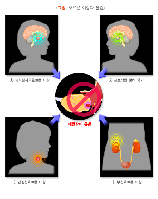 생식샘자극호르몬의 분비에 이상이 발생하는 경우, 뇌하수체에 '유선자극호르몬'이라고도 불리는 프로락틴(Prolactin)을 분비하는 종양이 발생하는 경우, 그리고 갑상샘이나 부신 등 호르몬을 생산하는 내분비샘에 이상이 발생한 경우에도 여성의 생식주기에 영향을 미쳐 불임을 일으킬 수 있습니다. 거식증이나 심한 다이어트로 극심하게 체중이 낮거나 반대로 지나치게 비만한 여성의 경우에도 배란장애가 발생할 수 있습니다.