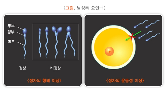 정상적인 임신을 위한 남성 측의 조건은 성숙하고 건강한 정자가 생산되어야 하고, 정자가 자궁을 통과하여 난자에 도달한 후 난자를 뚫고 수정을 할 수 있을 정도의 운동능력이 있어야 합니다. 그 외에도 정자가 정확한 방향을 향해 이동할 수 있도록 정상적인 모양을 가지고 있어야 하고, 정자가 여성의 생식기 속으로 쉽게 들어갈 수 있을 정도로 충분한 정액의 양이 필요하며, 또한 충분한 숫자의 정자가 정액 속에 포함되어 있어야 합니다. 그리고 정상적인 성행위가 가능하도록 발기 능력이나 심리적 요인 또한 중요합니다. 만약 이들 요소 중에서 어느 하나라도 문제가 있는 경우 불임이 발생할 수 있습니다.