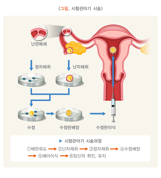 시험관아기 시술이 필요한 경우는 난관요인에 의한 불임증(나팔관 폐쇄, 나팔관 유착), 남성요인 불임증, 자궁 내막증, 원인을 알 수 없는 불임증, 인공수정에 여러 번 실패한 경우입니다. 시험관아기 시술에 필요한 다수의 난자를 얻기 위해 과배란주사를 맞으며, 초음파 검사를 통해 난포의 개수, 크기를 주기적으로 관찰합니다. 이후 정자와 난자를 채취하여 배양 접시에서 자연스러운 수정을 유도하거나 난자내 정자 직접주입술(Intracytoplasmic sperm injection, ICSI)방법을 사용하기도 합니다. 정관 폐쇄 등 무정자증에 의한 불임증의 경우 수술에 의해 정자를 채취할 수도 있습니다. 발달된 배아를 자궁내막에 이식합니다.
