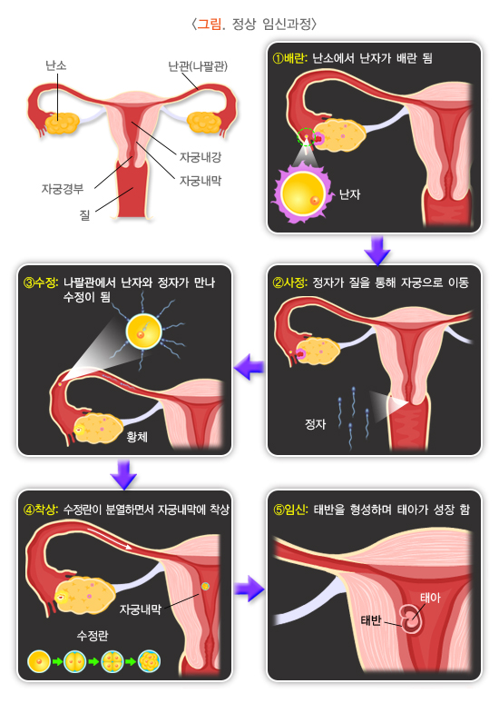 정자와 난자가 만나서 만들어진 수정란은 세포분열을 거듭하면서 난관을 따라 자궁 내부로 들어가 자궁내막에 착상을 하게 되고, 자궁내막이 부풀어 올라 수정란을 감싸면서 태반을 형성하면 임신이 이루어집니다.