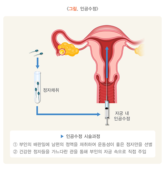 인공수정의 주요 적응증은 정자의 수와 운동성이 떨어진 경우와 원인을 알 수 없는 난임인 경우입니다. 여성의 배란기에 맞추어 남편의 정액을 받아 원심 분리를 통해 불필요한 성분을 제거하고 정자만 고농도 배양액에 처리해서 모은 후 여성의 자궁 속으로 직접 주입합니다. 인공수정은 보조생식술의 가장 첫 단계에 해당됩니다. 필요에 따라 여성은 자연 배란주기를 따르기도 하고, 배란유도제 혹은 주사제를 이용해 배란 유도할 수도 있습니다.