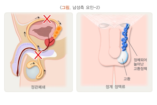정관이나 부고환 등 정자의 이동경로가 폐쇄되면 정액이 이동할 수 없어 불임의 원인이 됩니다. 일부 경우에는 선천적인 이상으로 발생하기도 하지만, 요로감염이나 염증, 수술 등에 의해 후천적으로 발생하기도 합니다.