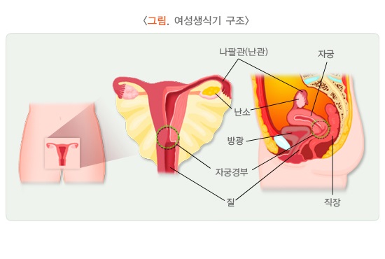 여성의 생식기는 자궁, 난소와 난관으로 구성되어 있는데, 난소와 난관은 좌ㆍ우측에 각각 하나씩, 두 개가 있습니다. 자궁은 여성의 복부 아래에 방광과 직장 사이에 위치하는 조롱박 혹은 서양배 모양의 생식 기관입니다. 자궁의 길이는 약 7.5 cm, 폭은 약 5 cm, 그리고 두께는 약 2.5 cm 정도로 손바닥 정도 크기입니다.